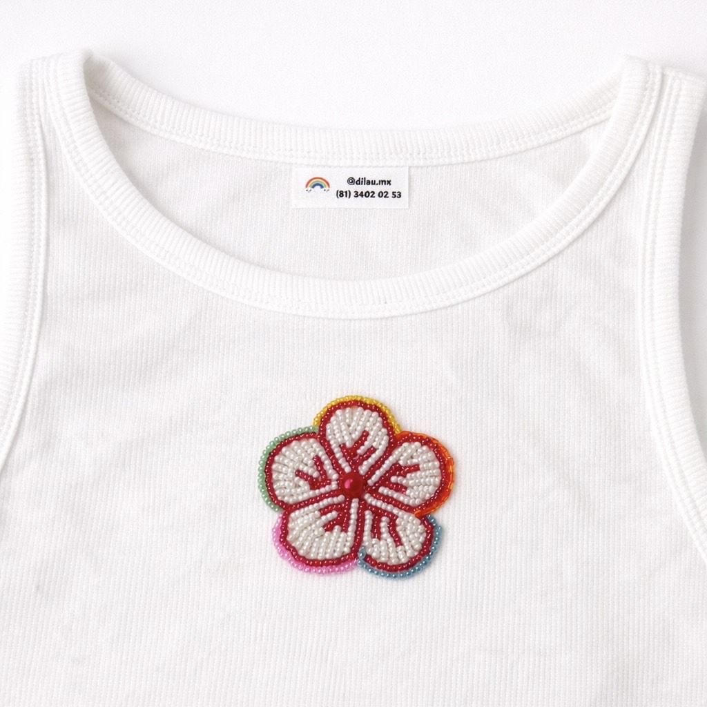 Tank Top Blanco único sin mangas bordado a mano con cuentas multicolor ,pétalos blancos , con diseño de flor.